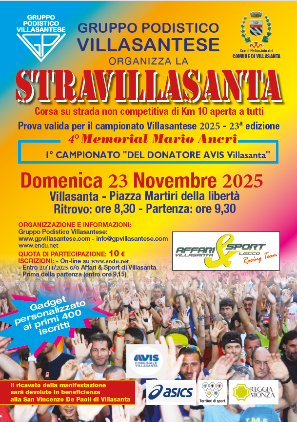 23 Novembre, la STRAVILLASANTA, Classicissima alla Edizione 23, ospita il PRIMO CAMPIONATO DEL DONATORE AVIS Villasanta!